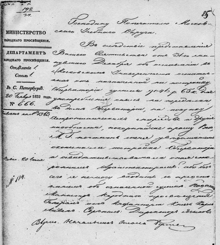 • 4) 31 декабря 1831 года С.М. Голицын обращается к К.А. Ливену с просьбой разрешить использовать средства, оставшиеся от строительства обсерватории, на покупку астрономических инструментов и книг. Ранее, 30 июня 1831 года, Голицын в письме Ливену упоминал сумму в 10 тысяч рублей.