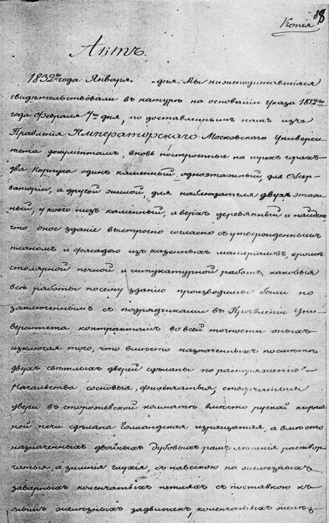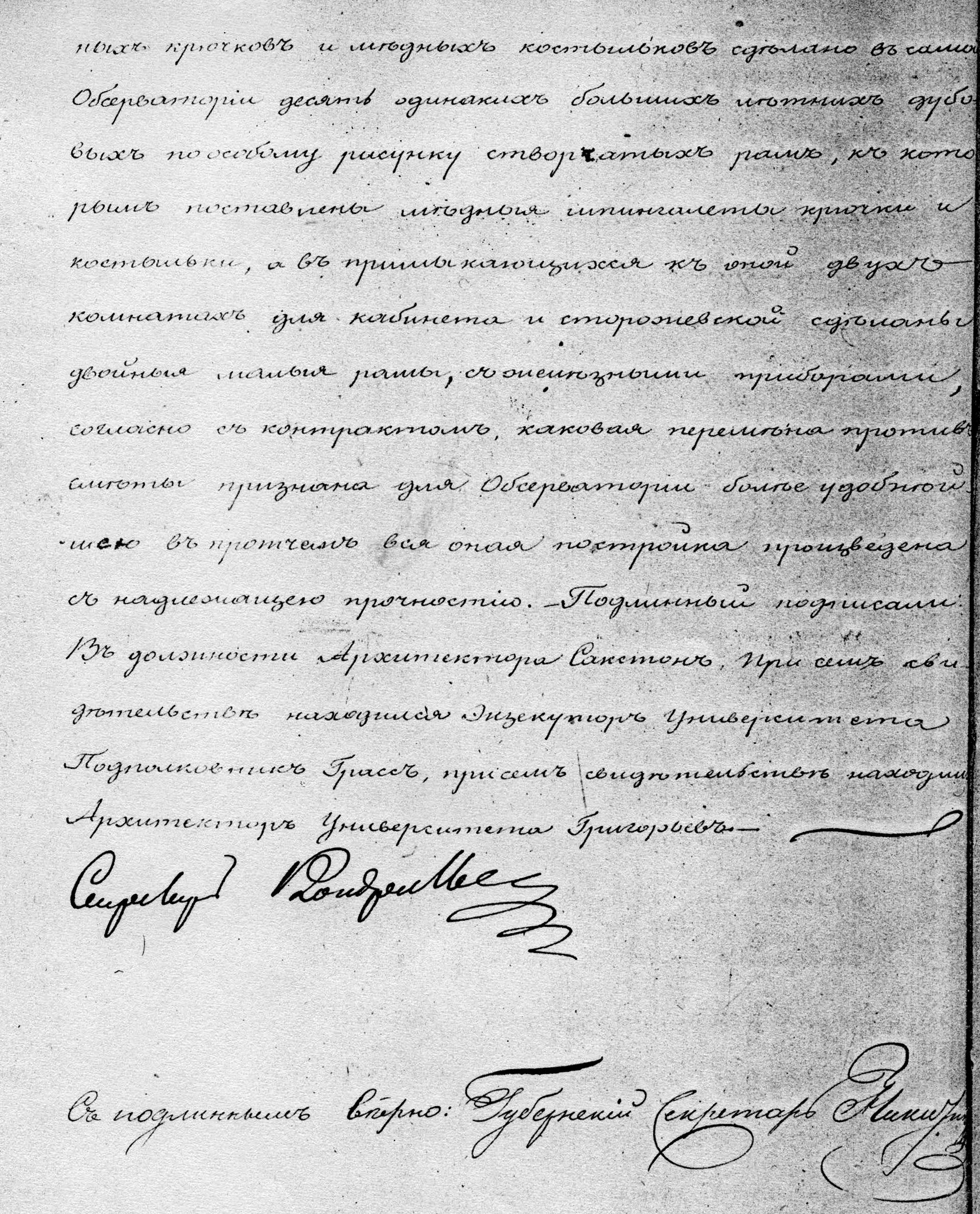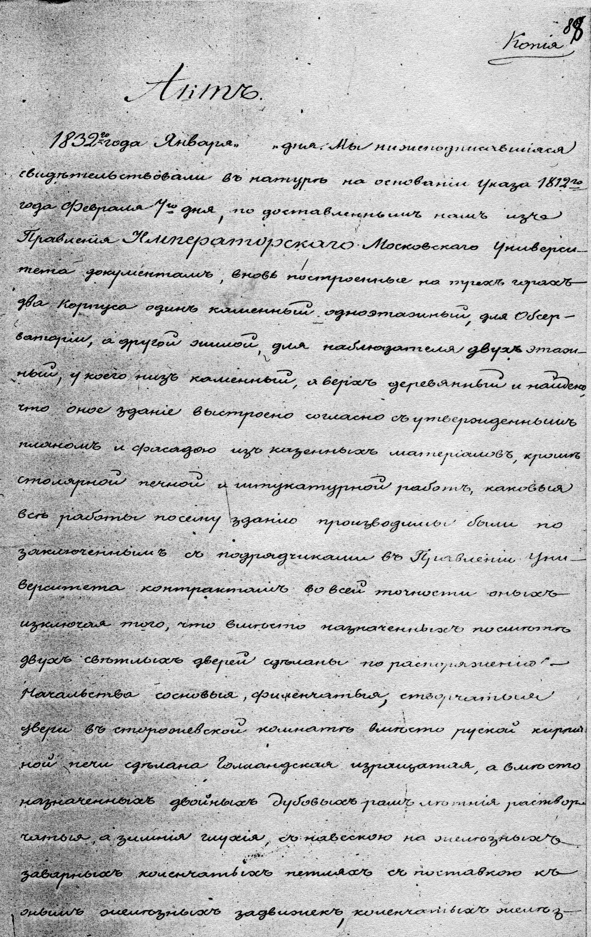 • 7) Только 1 сентября 1832 года С.М. Голицын сообщает наконец К.А. Ливену, что строительство обсерватории практически завершено и прилагает АКТ освидетельствования, а также около 40 копий контрактов с поставщиками. Копии явно изготовлены срочно, написаны на одной, весьма роскошной бумаге с золотым (!) обрезом, одним почерком. АКТ — тоже копия. В нем указано, что освидетельствование архитекторами проведено в январе 1832 года, число отсутствует. АКТ подписан только секретарем. Подписи архитекторов отсутствуют.