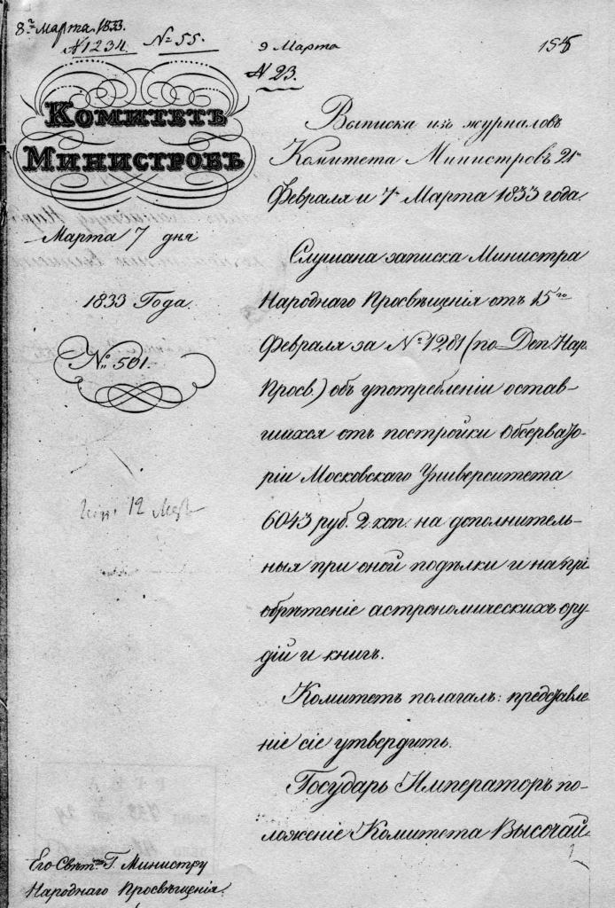 • 8) Точка в этом, прямо скажем странном, деле была поставлена только 7 марта 1833 года, когда император Николай I подписал разрешение оставить 6043 рубля 2 копейки на приобретение книг и инструментов. (Рис. 6, 7) Напомним, что первоначально в переписке Голицына и Ливена речь шла о сумме в 10 тысяч рублей.