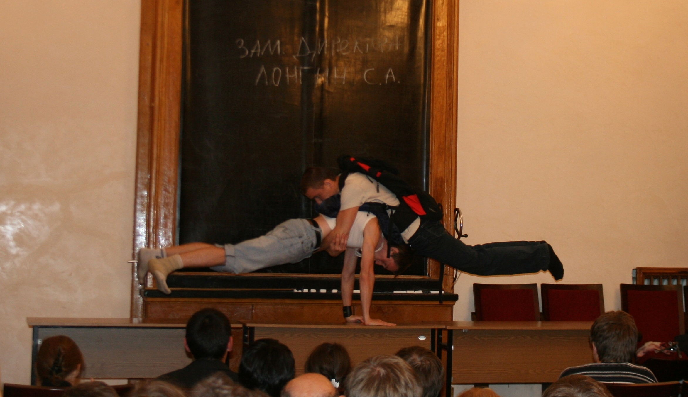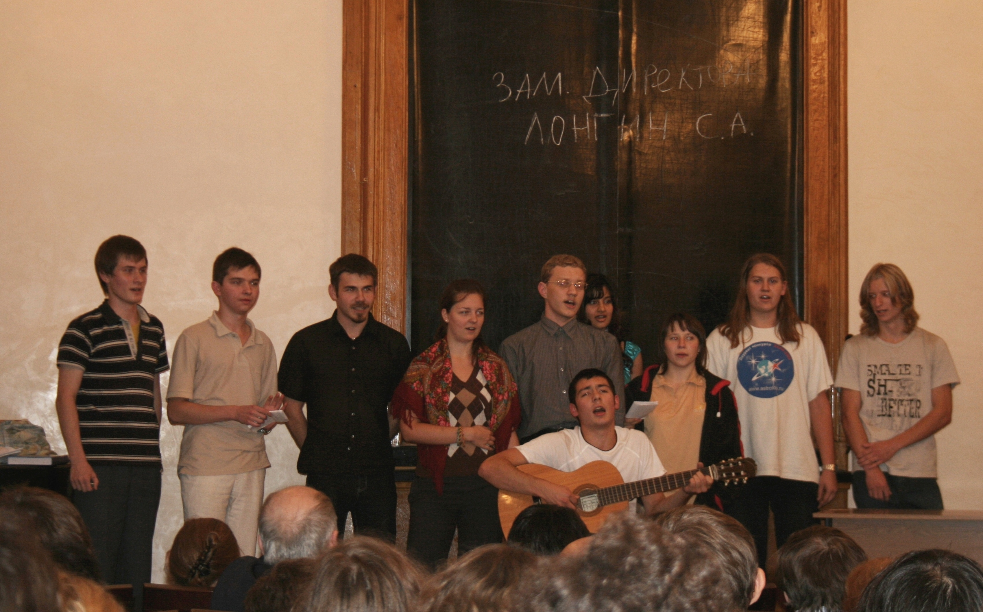 Помимо всего прочего на этом празднике все собравшиеся символически прощаются с последним курсом, которому уже вскоре предстоит защитить дипломы и выпуститься из ГАИШа. Они продемонстрировали залу фотографии, накопленные за учебные годы, спели лебединую песню собственного сочинения.