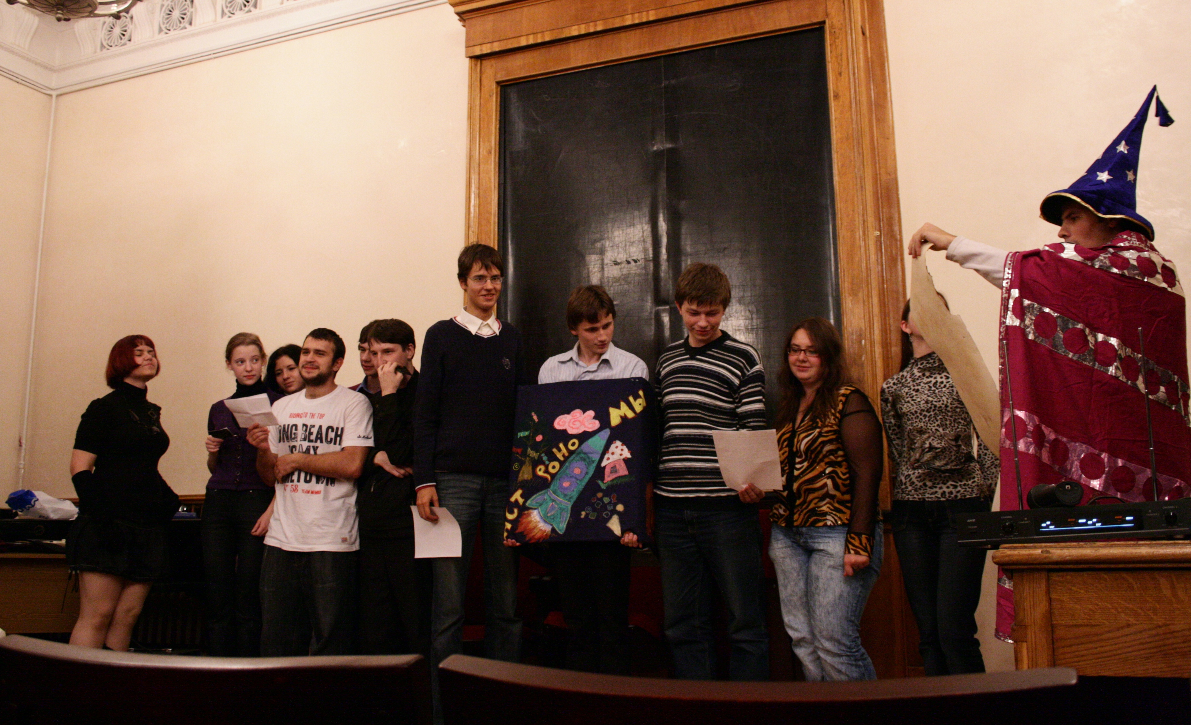 В конференц-зале собрались сотрудники ГАИШ, студенты и выпускники астрономического отделения физического факультета МГУ, астрономы из Санкт-Петербургского университета. Ключевой идеей этого вечера является посвящение первокурсников в астрономы, но это далеко не всё, что происходит на этом празднике.