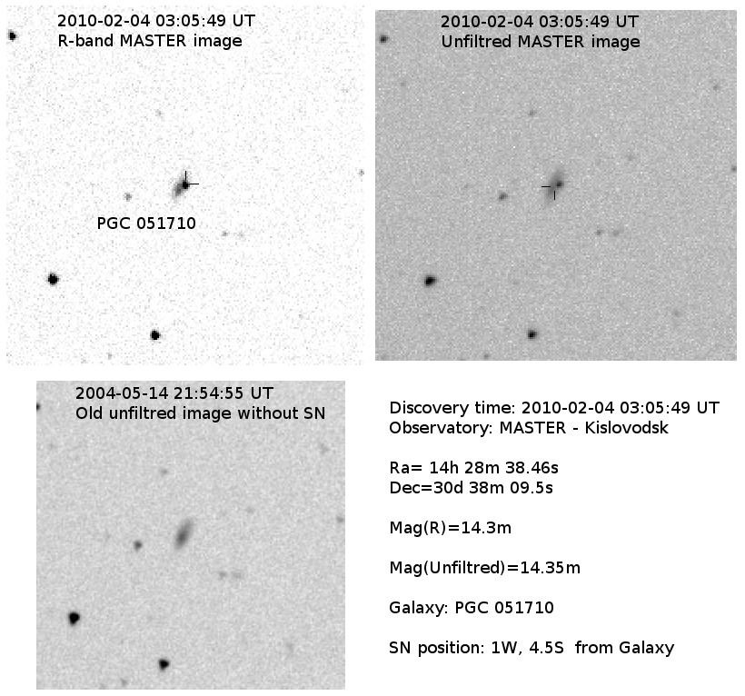 Сверхновая имеет тип Ia — это означает, что ее можно использовать для поиска темной энергии. Как происходит открытие на робот-телескопе? Телескоп сам автономно проводит обзор неба, обрабатывает изображения и выдает список, не отождествленных с известными объектов. Далее человек (профессор, кандидат, студент, школьник) по Интернет проверяет этот список и сообщает в Международный Астрономический Союз. В данном случае открытие по Интернет совершил студент Павел Балануца из Москвы (это его уже третья сверхновая).