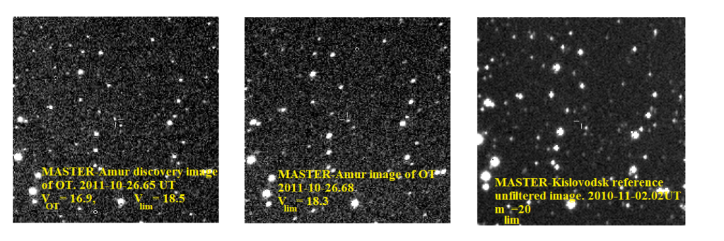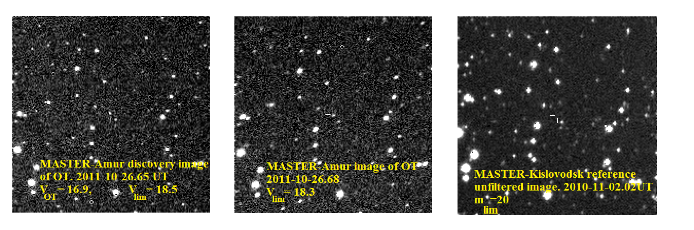 26 октября 2011г. на телескопе МАСТЕР в Благовещенске была открыта Сверхновая звезда 2011hh Iа-типа (CBET2888) по координатам 02h57m04.61s +49°47’43».3 (неизвестная родительская галактика). Ее звездная величина в момент открытия была V=16.9.