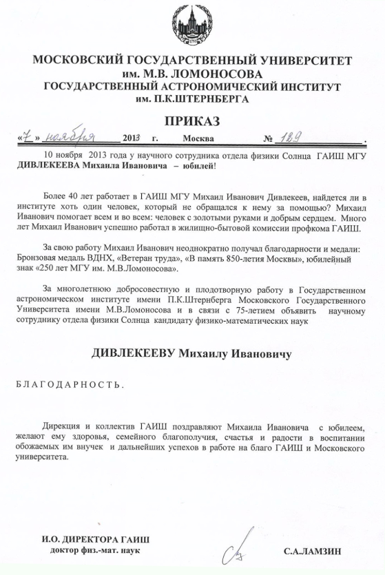 10 ноября 2013 года у научного сотрудника отдела физики Солнца ГАИШ МГУ Дивликеева Михаила Ивановича - юбилей!