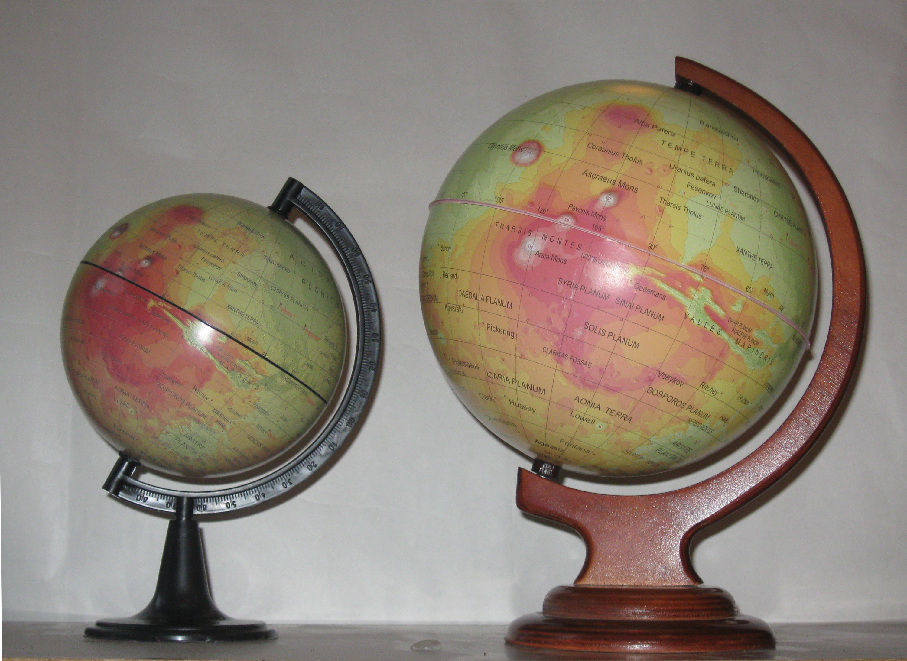 История создания глобусов Марса насчитывает более 150 лет. Наш глобус Марса отличается от других тем, что на нем показаны высотные уровни поверхности планеты с помощью горизонталей и послойной раскраски согласно разработанной цветовой шкале. Подготовлен он на основе Гипсометрической карты Марса масштаба 1:26 000 000, составленной в Государственном астрономическом институте им. П.К. Штернберга (ГАИШ МГУ) при участии кафедры картографии и геоинформатики Географического факультета МГУ им. Ломоносова. Высоты на карте показаны по результатам альтиметрической съемки американского аппарата «Марс Глобал Сервейер». Гора Олимп имеет высоту 21 км, а на дне Равнины Эллады имеются отметки -8,2 км.