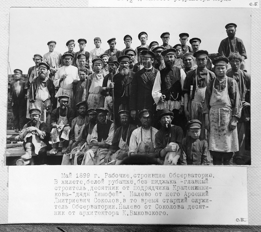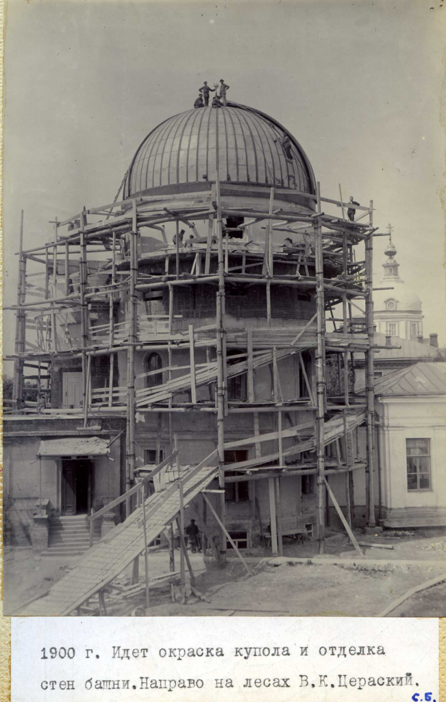 В Музее истории астрономии, который находится в главном здании АО, сохранился старинный альбом с фотографиями, на которых изображены различные этапы реконструкции обсерватории. Фотографии и подписи к ним были сделаны учеником В.К.Цераского, сотрудником АО С. Н. Блажко. Ученик Цераского, еще студентом начавший работать на АО, С.Н. Блажко также является автором фундаментальной «Истории Московской астрономической обсерватории», вышедшей в свет в 1940 году [1]. В своей «Истории» Блажко ничего не говорит о том, по чьему архитектурному проекту осуществлялись строительство Назаровской башни и перестройка главного здания АО. Однако на подписи к одной фотографии, на которой изображена бригада рабочих, осуществлявших возведение нового купола, есть слова «десятник от архитектора К. Быковского».