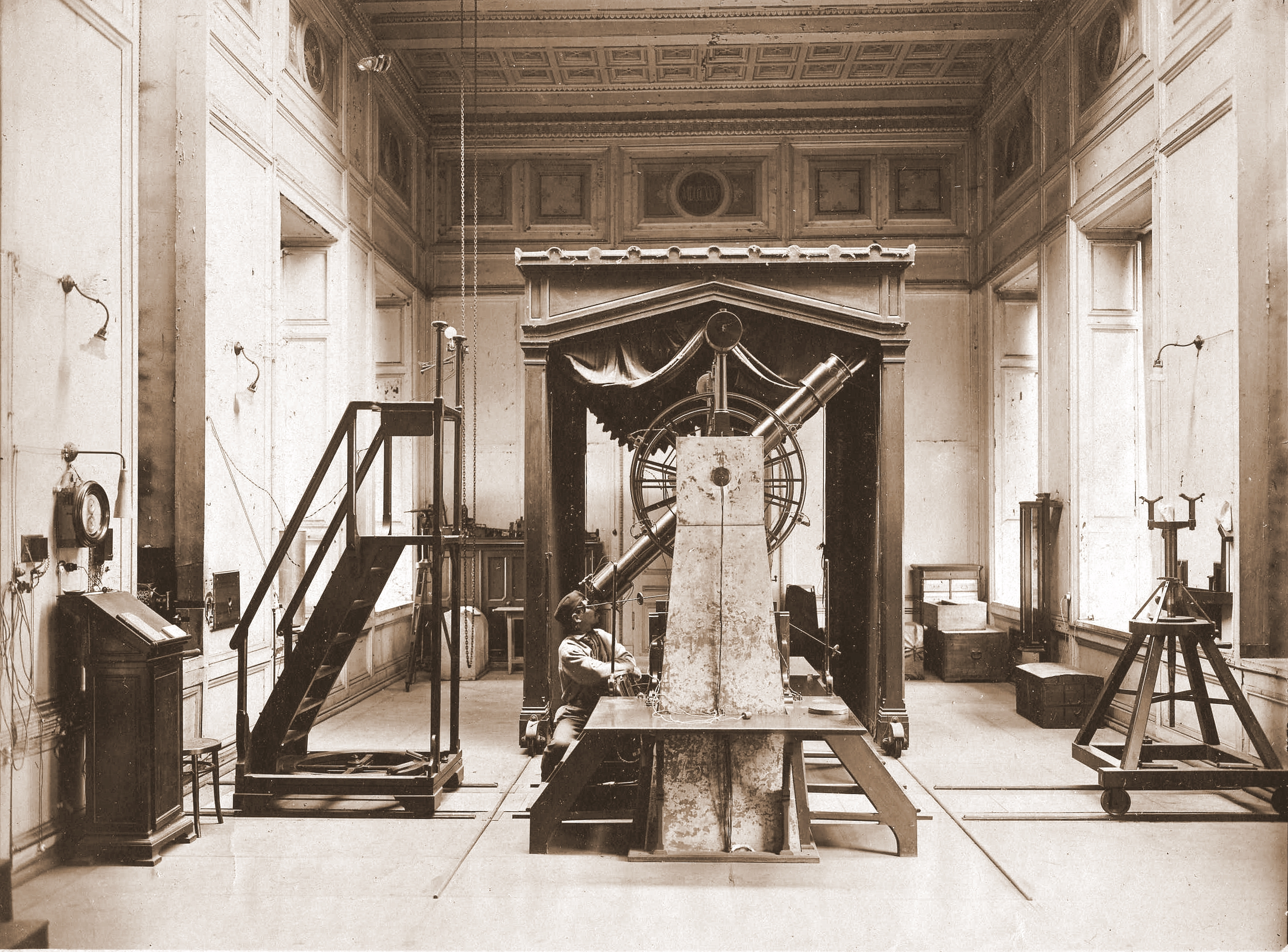 Вскоре после установки купола в башне главного здания был смонтирован 15-дюймовый телескоп-астрограф, в то время являвшийся одним из самых больших инструментов в России. (Рис. 13) В период с 1901 по 1903 гг. был реконструирован один из важнейших элементов обсерватории — ее меридианный зал. (Рис. 14) К сожалению, этот зал не сохранился. Он был ликвидирован в 1949 году, так как после войны начался быстрый рост числа сотрудников ГАИШ, размещение которых в небольших помещениях АО было не возможно. Предвидеть же, что всего через 4 года ГАИШ получит новое здание на Ленинских горах, тогда не мог никто.