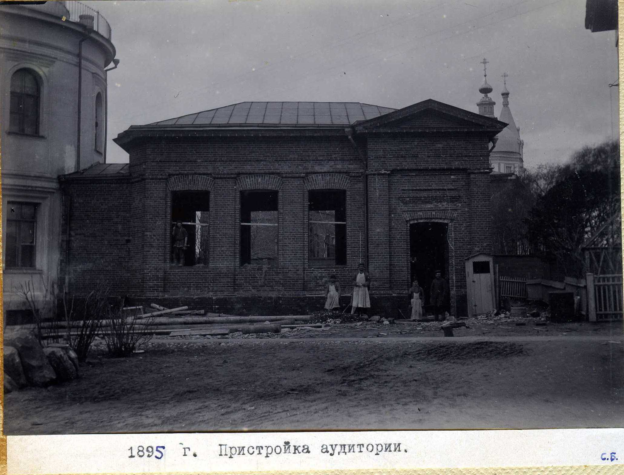Строительные работы на территории АО начались летом 1895 года. Вначале были возведены стены северного крыла главного здания АО, в котором разместилась учебная аудитория. (Рис. 6) Под этим крылом, на глубине 6 метров была сделана подземная комната, в которой находились особо точные часы, обеспечившие АО статус хранительницы точного времени. Полностью строительство и оборудование аудитории завершилось в 1896 году, а весной 1897 года в ней начались учебные занятия. (Рис. 7) Интересно отметить, что в аудитории были устроены хоры для размещения проекционных фонарей, а также для нахождения там слушателей, не входивших в число студентов. Тем самым в какой-то степени была воспроизведена идея амфитеатров, блестяще примененная Быковским в других учебных аудиториях Московского университета.