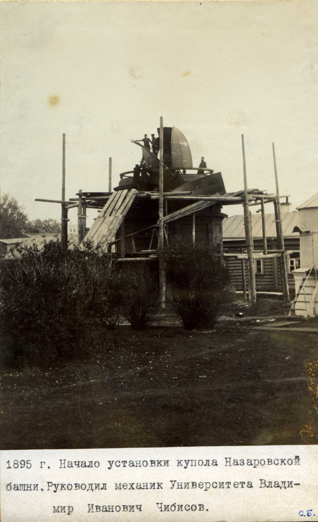 Одновременно со строительством северного крыла началось сооружение в центре двора АО вспомогательной башни, получившей позже название Назаровской. В течение лета 1895 года были возведены стены башни и столб для 7-дюймового телескопа. В сентябре фирма Густава Гейде (Дрезден) поставила для башни 5-метровый купол, который в октябре был установлен под руководством университетского механика Владимира Ивановича Чибисова. (Рис. 8) Летом 1896 года в Назаровской башне был настлан паркет, на первом этаже устроена перегородка, стены башни оштукатурены и выкрашены. Купол был выкрашен водостойкой серой алюминиевой краской. Интересно отметить, что Г. Гейде, гордившийся тем, что его фирма получила заказ на строительство куполов для Астрономической обсерватории Московского университета, использовал фотографию Назаровской башни на фирменных бланках. (Рис. 9, 10).