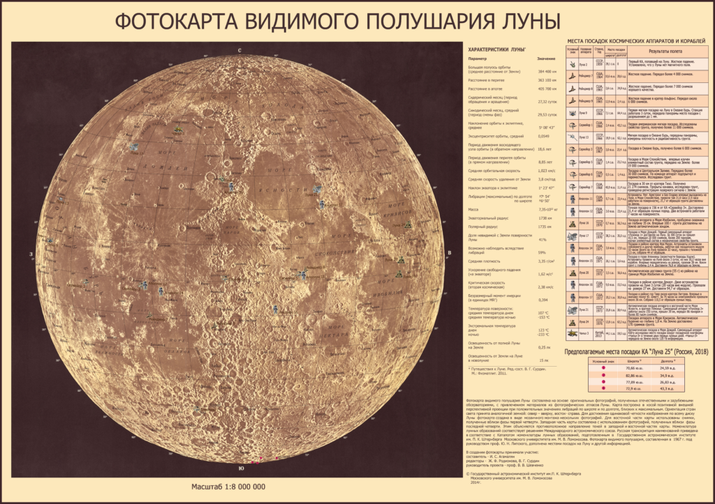 Диаметр лунного диска на карте 483 мм. За основу карты взято мозаичное изображение видимого полушария, составленное под руководством Ю.Н. Липского в 1967 году. Карта дополнена современными данными об основных характеристиках Луны и кратким описанием результатов исследований, начиная с АМС «Луна 2», запущенной в СССР в 1959 г., и заканчивая китайским аппаратом «Чанъэ 3», в 2013 г. доставившем в Море Дождей луноход «Юйту». Фотокарту можно приобрести в библиотеке ГАИШ МГУ. Составитель карты Агамалян И.С., Редакторы: Родионова Ж.Ф. и Сурдин В.Г. Руководитель проекта — проф. Шевченко В.В.