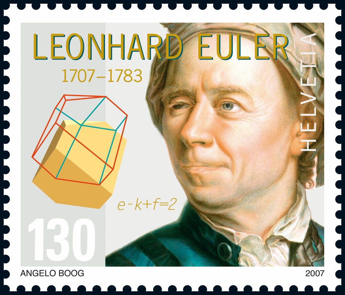 На пути решения этих проблем Эйлер стал основоположником целых новых направлений и наук, как в области высшей математики, так и в теоретической механике. Бесчисленное количество математических образов и остроумных методов решения задач содержит имя Эйлера: «Эйлеровы числа», «Эйлера уравнения», «Эйлера подстановки». Наиболее изящные были отражены даже на памятных марках. Это, например, удивительная «Эйлерова характеристика» выпуклых многогранников: ao-a1+a2=2 (число вершин минус число ребер плюс число граней в любом таком многограннике равно двум). Правда, как говорят, это было известно уже Декарту, но, видимо, было забыто и переоткрыто Эйлером. Или — красивая формула связи между показательной и тригонометрическими функциями: eiφ=cosφ+isinφ.