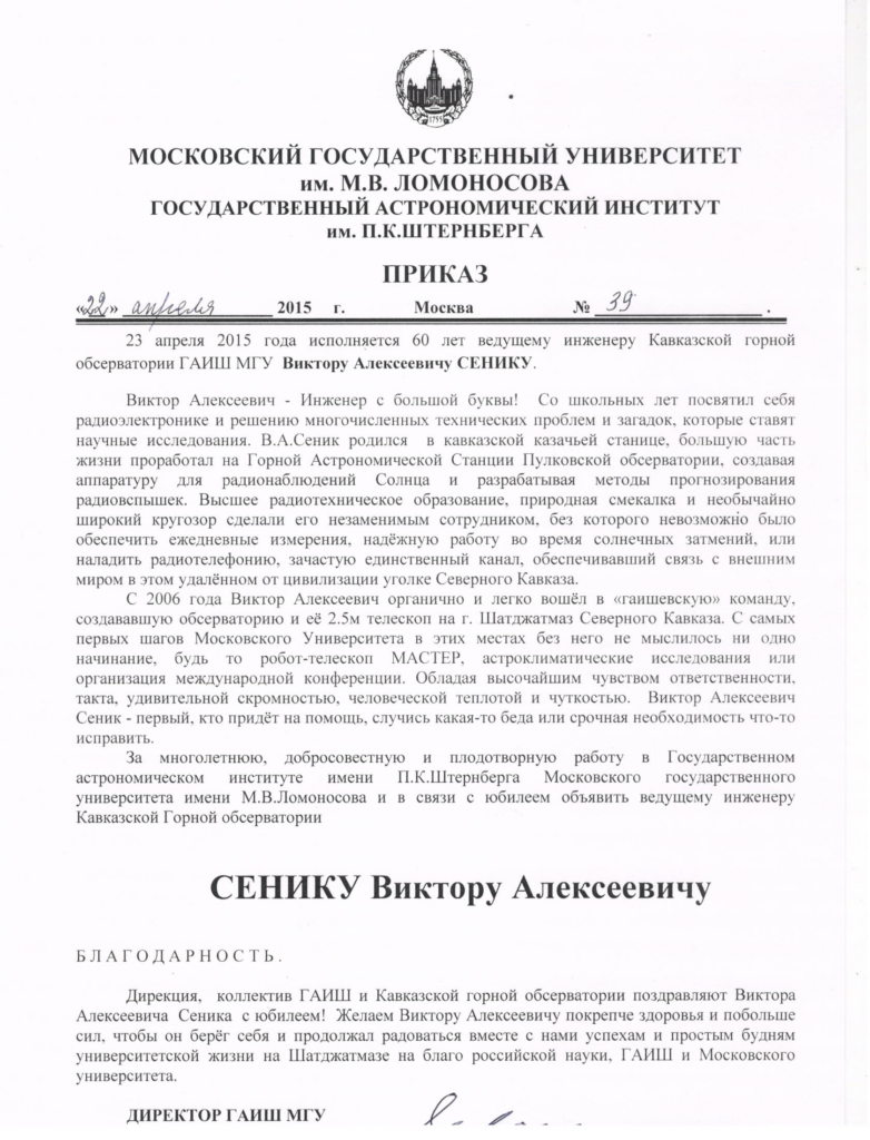 Дирекция, коллектив ГАИШ и Кавказской горной обсерватории поздравляют Виктора Алексеевича Сеника с юбилеем!