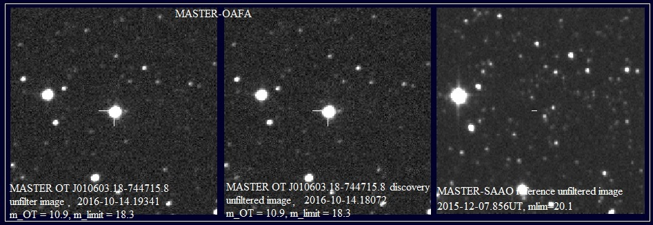 Телескоп-робот MASTER-OAFA, установленный этим летом в Аргентине на обсерватории Национального университета Сан-Хуан, 14 октября 2016г. открыл Новую звезду MASTER OT J010603.18-744715.8 в Малом Магеллановом.