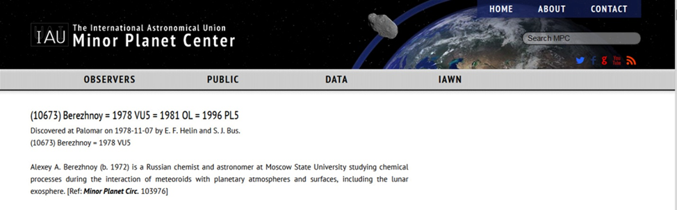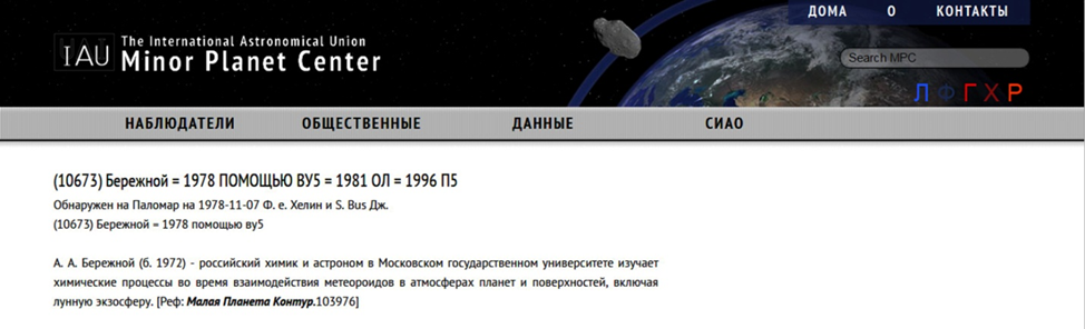 А.А.Бережной — российский химик и астроном в Московском государственном университете изучает процессы во время взаимодействия метеоритов в атмосферах планет и поверхностей, включая лунную экзосферу. (Реф:Малая Планета Контур. 103976