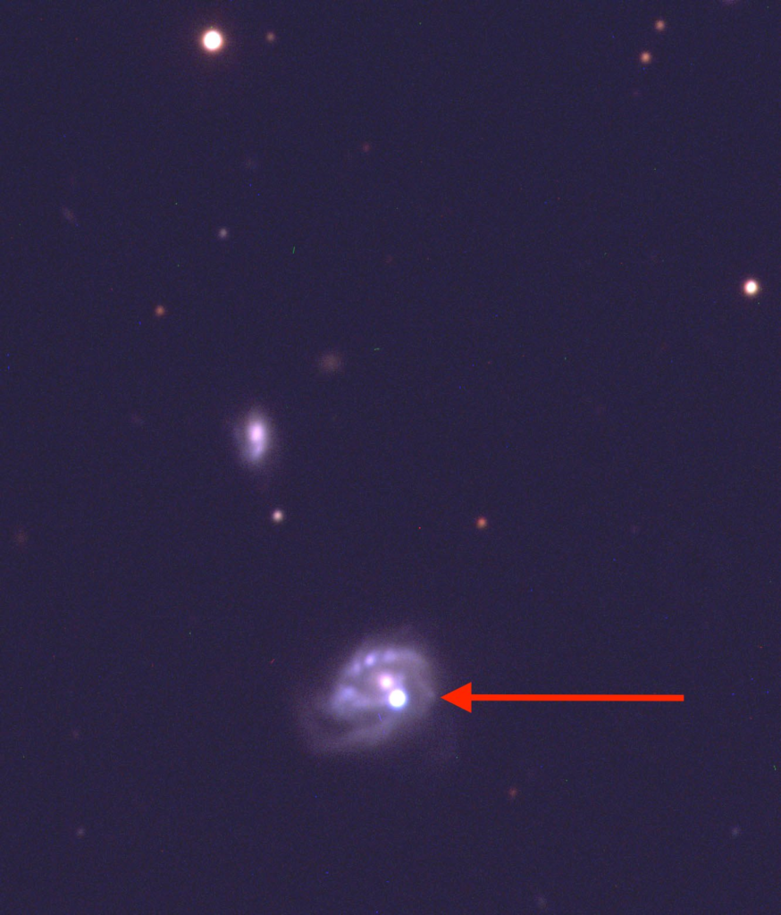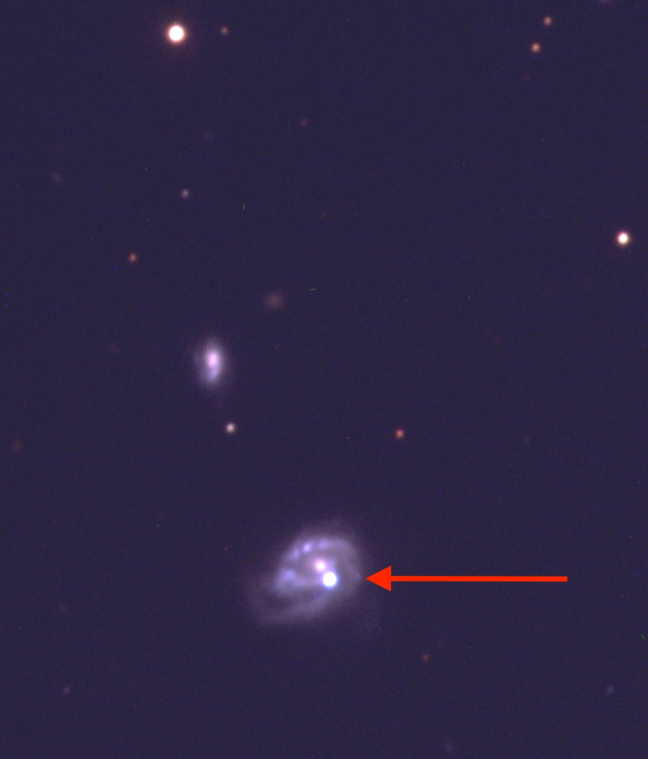 На этом комбинированном из BVR-изображений цветном снимке, полученном вечером 3 июля 2017 года на 2.5м телескопе, — Сверхъяркая сверхновая SN2017egm, открытая 23 мая 2017 астрометрическим спутником GAIA в галактике NGC3191 (созвездие Большая Медведица, расстояние до галактики 3 миллиардов световых лет) и вспыхнувшая, судя по кривой блеска, примерно на неделю раньше.