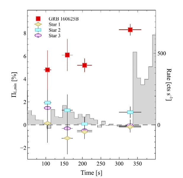 В результате МАСТЕР не только снял весь фильм о взрыве с лучшим разрешением по времени, но и впервые в истории исследования гамма-всплесков зарегистрировал поляризацию оптического излучения гамма-всплеска в тот момента, когда вспышка еще продолжалась.