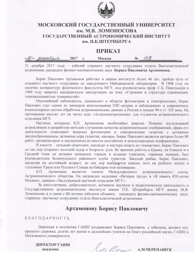 80 лет Борису Павловичу Артамонову, старшему научному сотруднику отдела Внегалактической астрономии ГАИШ, кандидату физико-математических наук.