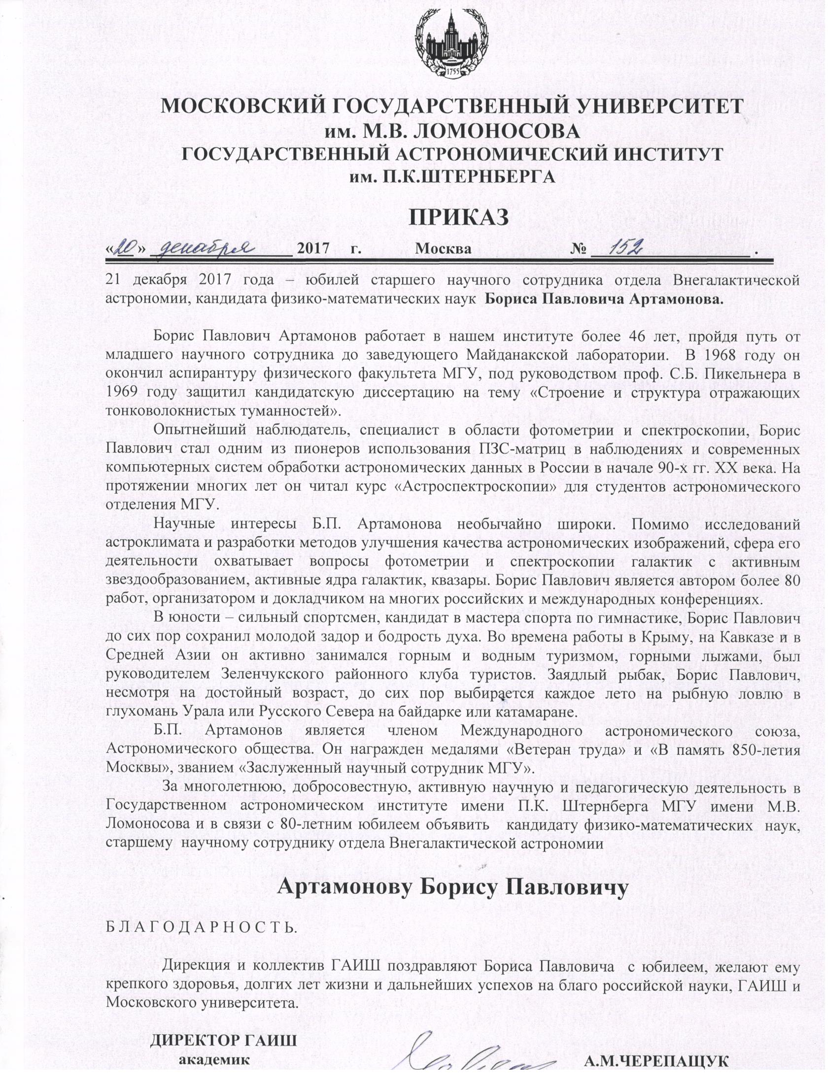 80 лет Борису Павловичу Артамонову, старшему научному сотруднику отдела Внегалактической астрономии ГАИШ, кандидату физико-математических наук.