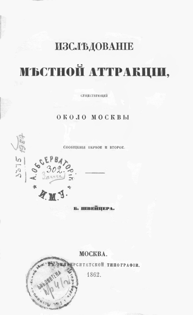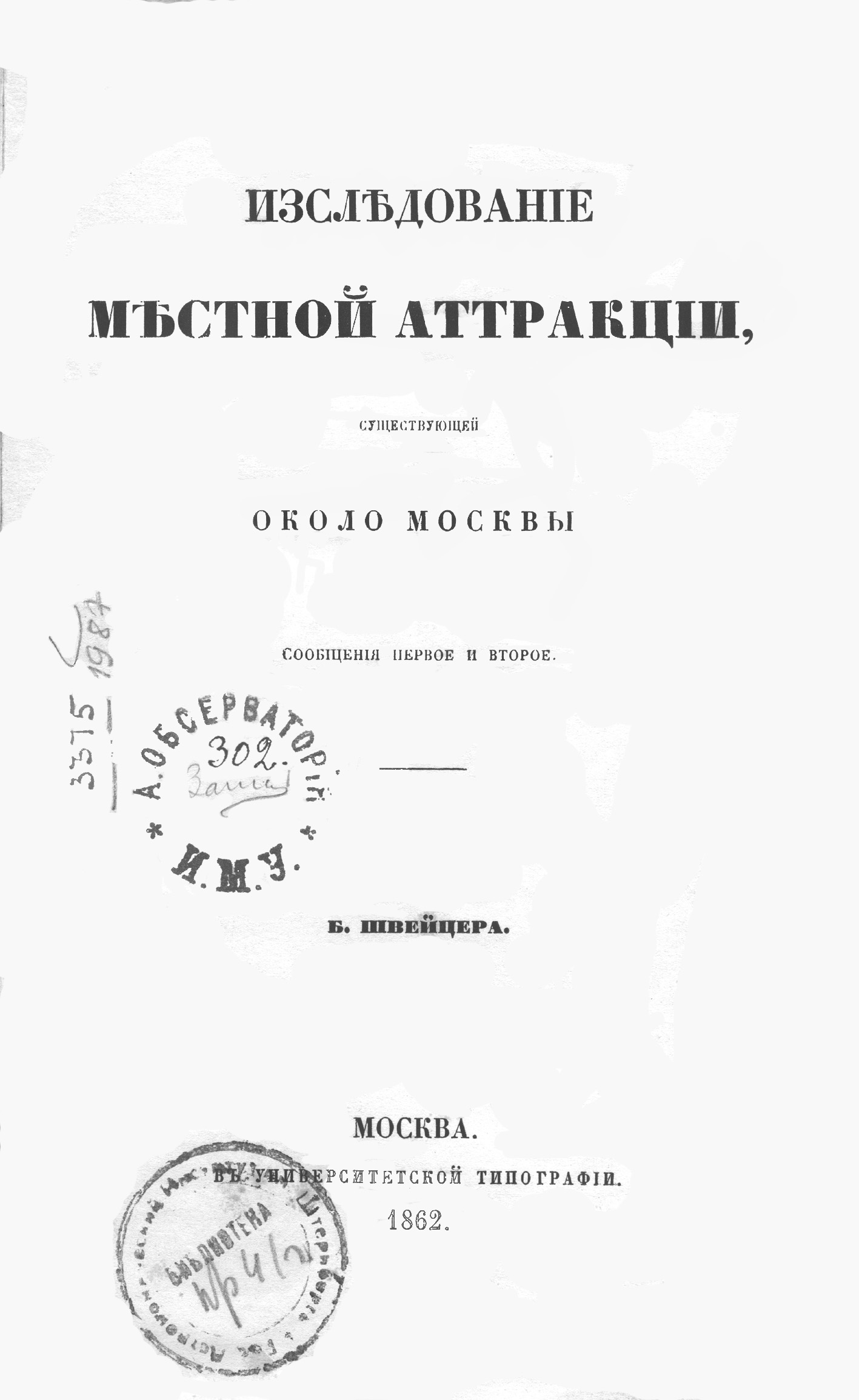 - Швейцер Б.Я. Исследования местной аттракции, существующей около Москвы. М., 1862.