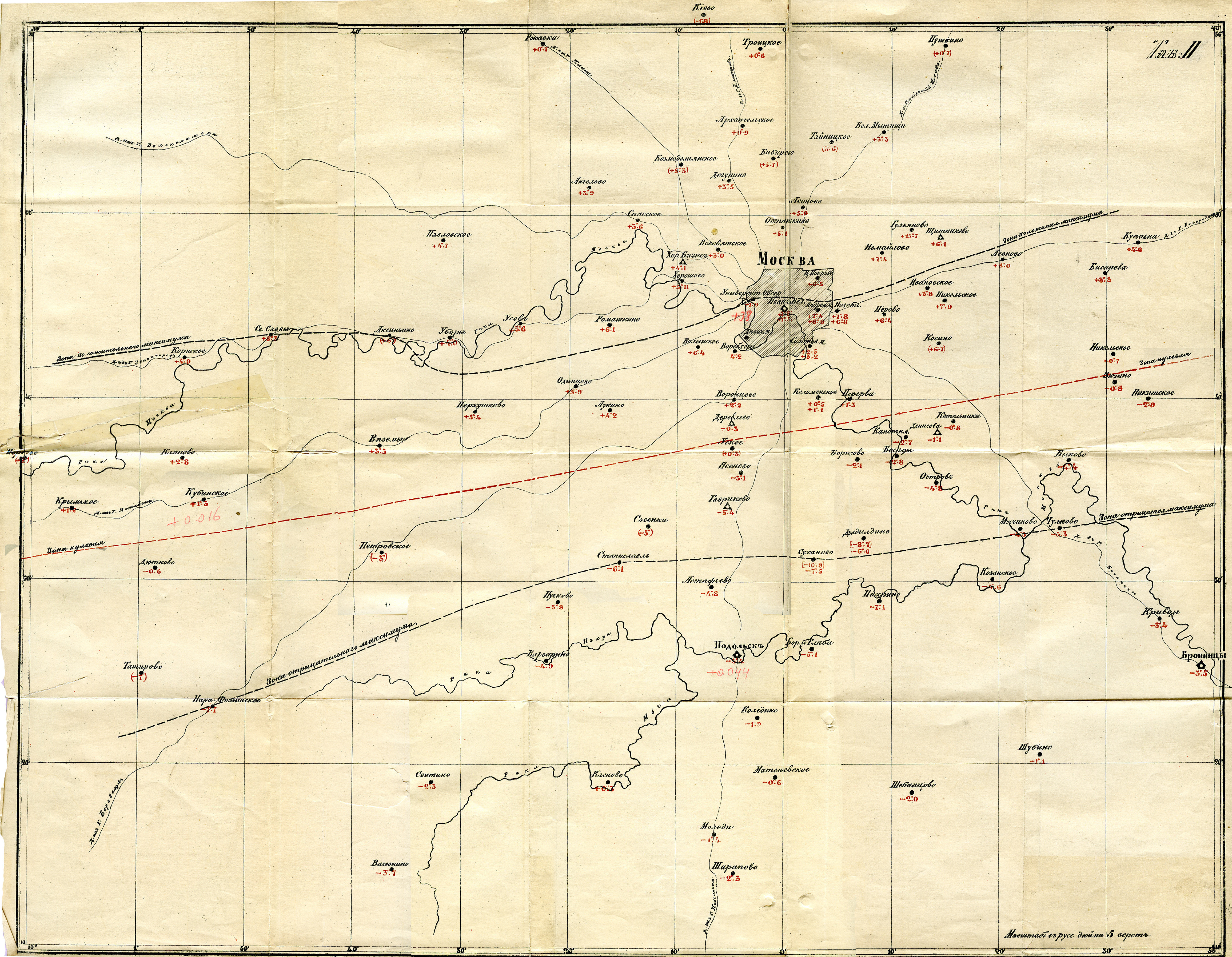 Из карты, составленной Б.Я. Швейцером, видно, что линия нулевых значений отклонения отвеса проходит на 12 км южнее центра Москвы, почти по параллели. Симметрично по отношению к этой линии, на расстоянии ± 12 км от нее проходят линии положительных (к северу) и отрицательных (к югу) максимумов отклонения, достигающих 9 угловых секунд.14 На первый взгляд величина отклонения очень мала. Тем не менее, именно она обусловила различия значений координат, обнаруженные в ходе геодезической съемки 1839 года. Интересно отметить, что линия максимальных положительных отклонений отвеса, а тем самым и степень «перекошенности» поля тяготения, проходит прямо через центр Москвы, точнее через Красную площадь. Поэтому одним из первых пунктов, при определении астрономических и геодезических координат которого были выявлены расхождения, стала колокольня Ивана Великого в Кремле. По отношению к геометрическому перпендикуляру она стоит наклонно, но этот наклон можно обнаружить лишь при помощи специальных наблюдений.