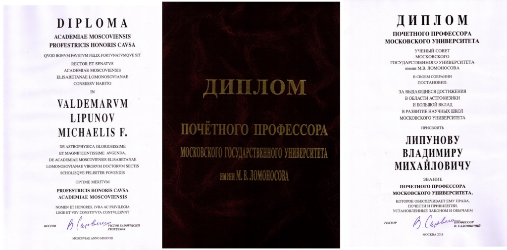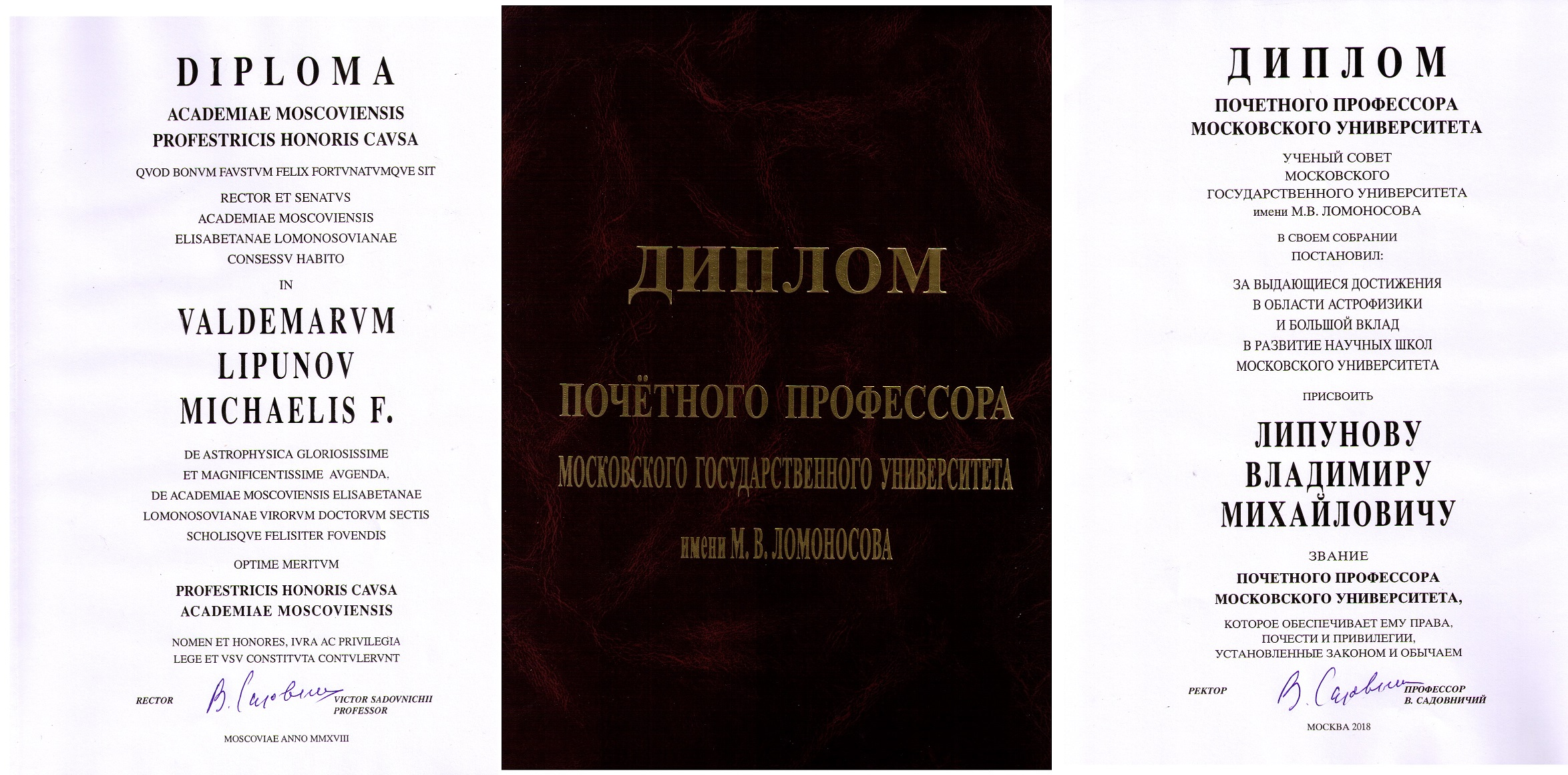 1 сентября 2018г. на торжественном собрании в Актовом зале МГУ имени М.В.Ломоносова Ректор Виктор Антонович Садовничий вручил Диплом и медаль Почетного Профессора Московского Университета заведующему лабораторией космического мониторинга ГАИШ МГУ, руководителю Глобальной сети телескопов-роботов МАСТЕР МГУ, профессору Липунову Владимиру Михайловичу за выдающиеся достижения в области астрофизики и большой вклад в развитие научных школ Московского Университета.