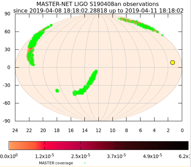 Телескопы-роботы Глобальной сети МАСТЕР в первую же ночь начали инспект 400 квадратных градусов (90% вероятности).