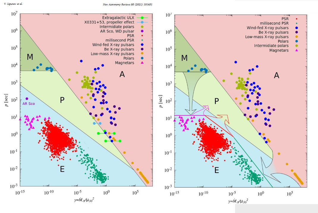 Но диаграмма не только объясняет, но и подсказывает, как обычные радиопульсары (красные точки) затухают, переходя на стадию пропеллера, а некоторые из них – те, что оказались в двойных системах, – потом превращаются в рентгеновские пульсары (синие и фиолетовые кружочки).